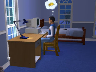 Castor has just finished his Term Paper. In the back you can see another small modification I have made to this room: I have removed the second bed (it still was the original cheap one) and added a wardrobe.