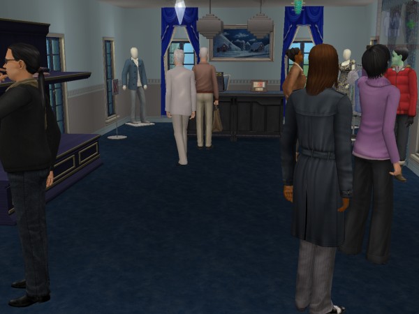 For most of the day, she gives financial consulting, raising the contents of her bank account from 265 to 1.015 Simoleons. As she still has not found a job in her dream career, in spite of checking every day, I think this is a good way of keeping the repo man away.