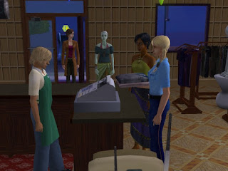 Then, Isabella Indie rings and invites her for an outing. As I still want to stick to my rule of sending my Sims to a community lot at least once a week, and Demi is not overly tired yet, she accepts the invitation. The taxi drops the group off in front of Belle's Boutique and Tayloring.